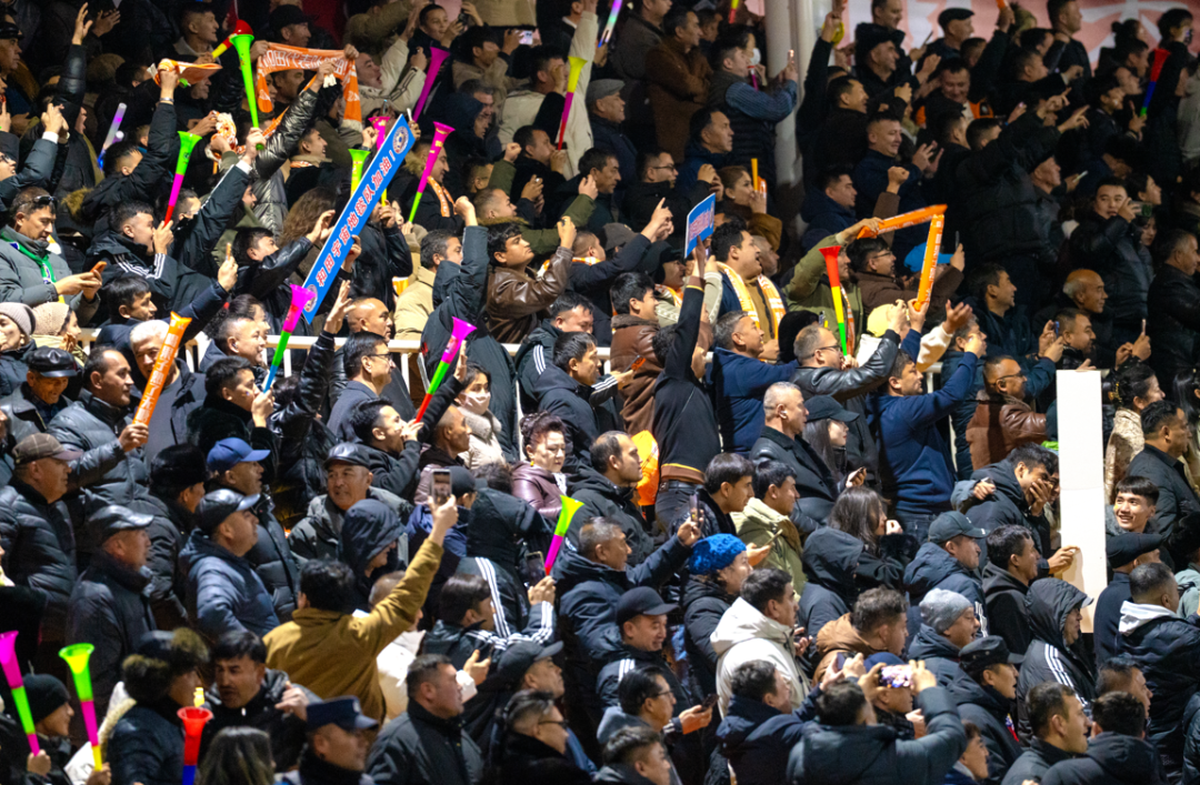 夜幕下的阿图什市足球公园灯光璀璨、人声鼎沸。看台上,从踮脚欢呼的孩童到摇旗助威的老者,各族群众热情高涨,处处洋溢着对足球运动的热爱。