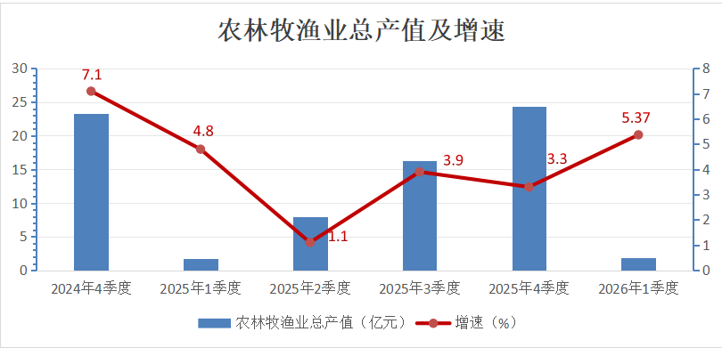 (一)农牧业生产总体稳定。一季度,全市农林牧渔业完成总产值增长5.37%。其中,农业产值增长163%;林业产值下降62.72%;牧业产值增长4.14%;渔业产值下降28.77%;农林牧渔业服务业产值增长3.72%。