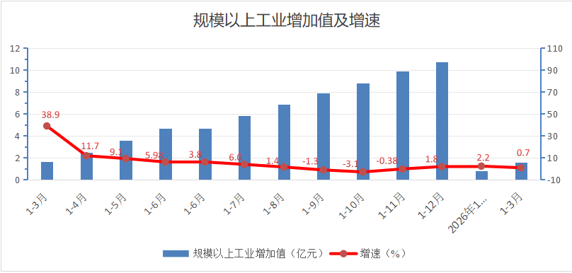 (二)规模以上工业增加值增速回落。一季度,全市32家规模以上工业企业完成工业总产值增长21.02%;增加值增长0.7%。