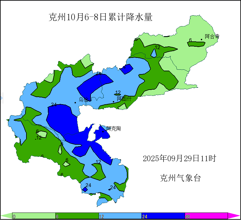 10月6日夜间~8日,各地将断续有小到中雨,其中吐古买提乡至哈拉峻乡累计降水量可达25~50毫米。
