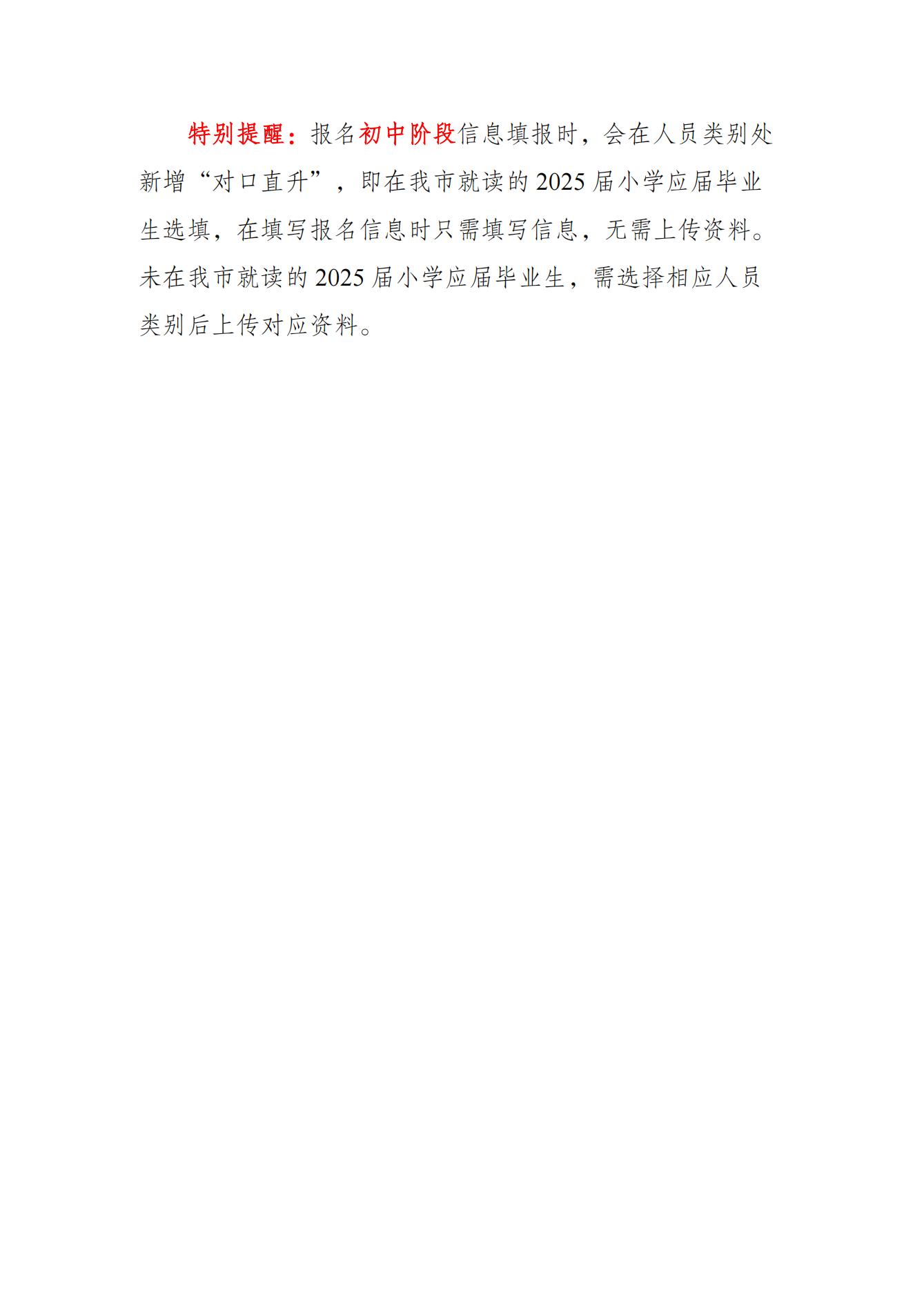 初中阶段:(1)在我市就读的2025届小学应届毕业生采取对口直升方式(详见附件1)升入相应初中。(2)未在我市毕业或不在初中对口直升的小学就读的2025届小学应届毕业生,按照“免试就近、片区划分”原则,以居住地进行报名,录取方式参照小学阶段。