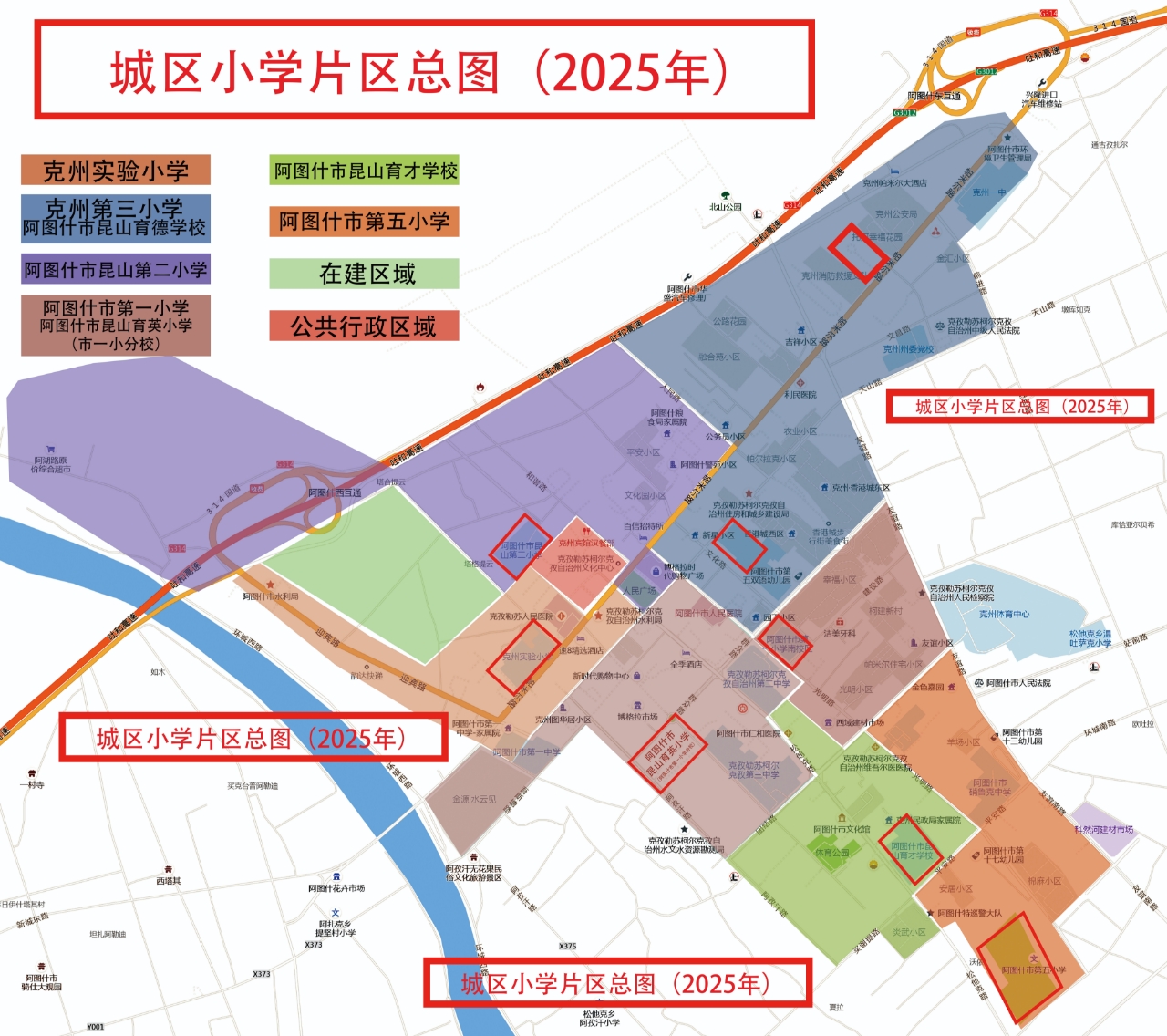 (三)2025年秋季,克州实验小学、阿图什市昆山第二小学、阿图什市第五小学、昆山育才学校不再调整招生片区,以2024年招生片区为主开展招生工作。持续推进大学区招生改革,在全市试点推进2个大学区招生,即:“阿图什市第一小学与阿图什市昆山育英小学”片区作为一个大学区;原克州第三小学招生片区作为“克州第三小学与阿图什市昆山育德学校(位于原玛纳斯小区处的新建学校)”的大学区。大学区内符合入学条件的适龄儿童,可依据家庭住址与两所学校的实际距离,自主选择其中一所学校提交入学申请。在招生录取环节,两校将以学生家庭住址与学校间的距离、多孩同校作为核心考量因素,结合学位供给情况优先保障距离较近符合条件的学生入学,大学区内两所学校因学位不足原因未录取的学生,将由市教育局统筹安排到其他相对就近且有空余学位的学校就读,确保每一位适龄儿童少年有学上。