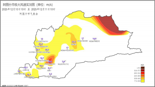 12月10日10时至11日10时,全市共有19站出现7级及以上大风天气,10站出现8级,4站出现9级,1站出现10级,大风极值出现在阿湖乡托格拉克村为28.8m/s(10级)。