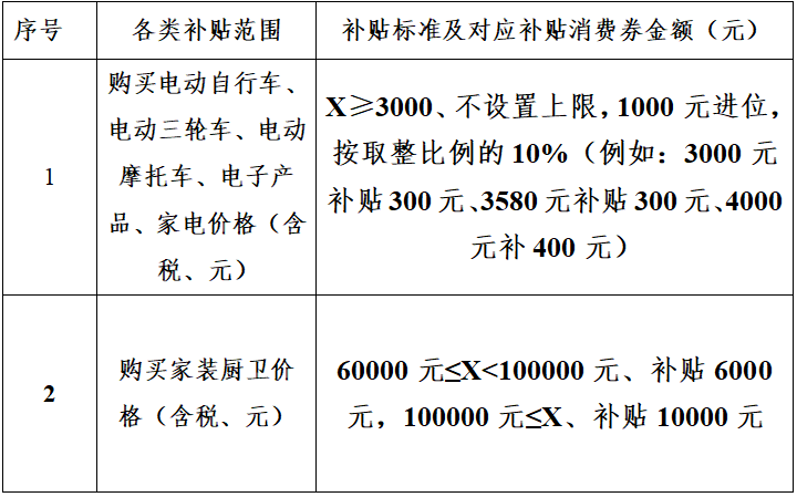 2.补贴产品范围:电动自行车、三轮车、摩托车,家装厨卫、家电、电子产品(手机、电脑等)